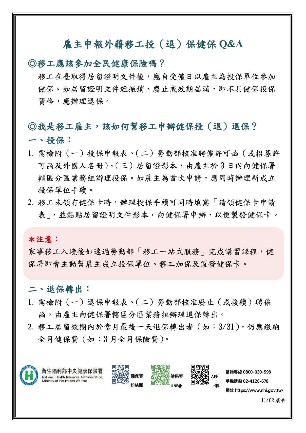 •[另開新視窗]雇主申報外籍移工投(退)保健保Q&A •[另開新視窗]轉帳代繳健保費 免出門 真方便