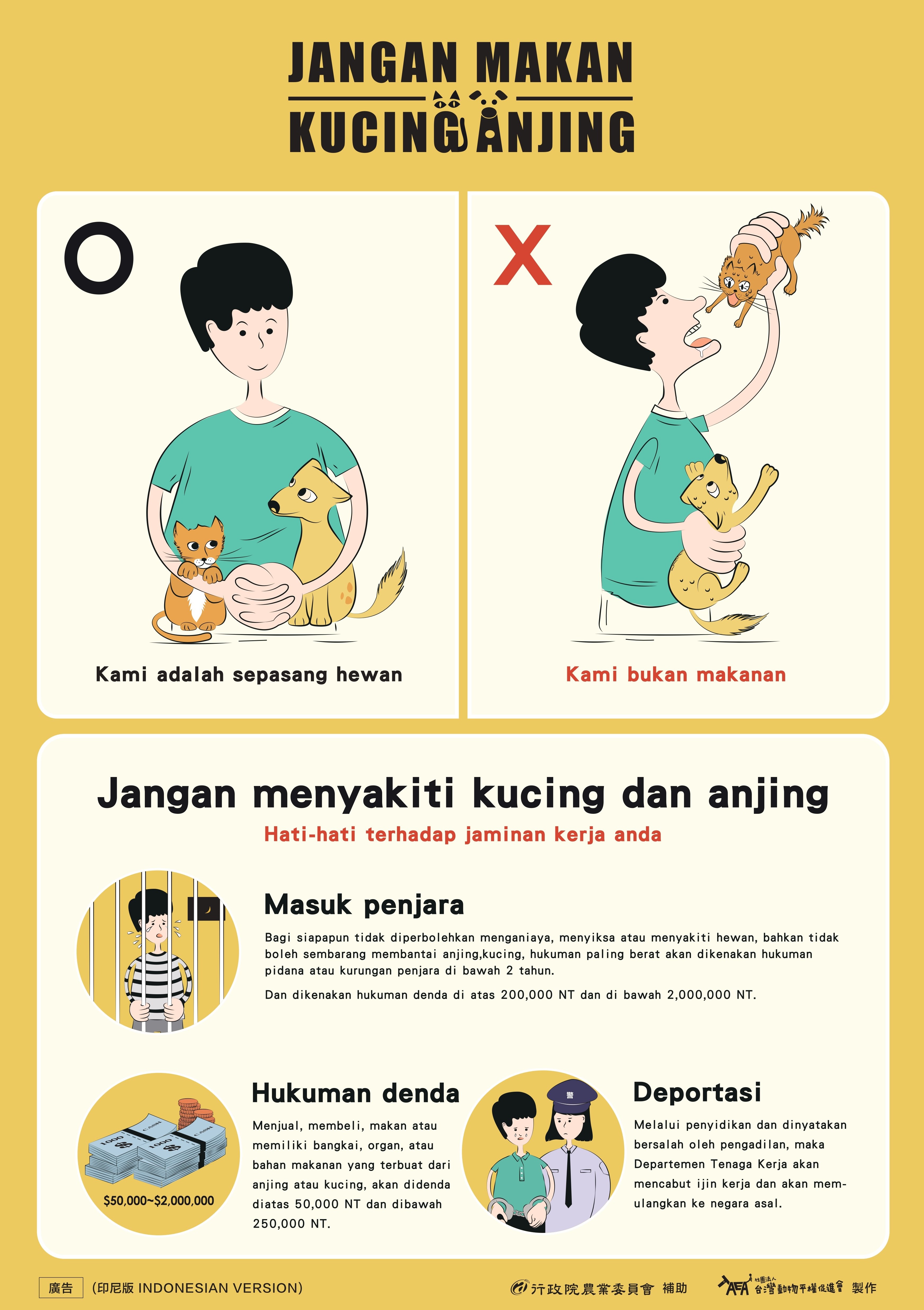 活動訊息:(農業部)避免移工違反我國禁止宰殺及食用犬貓宣導海報-多國語言版
