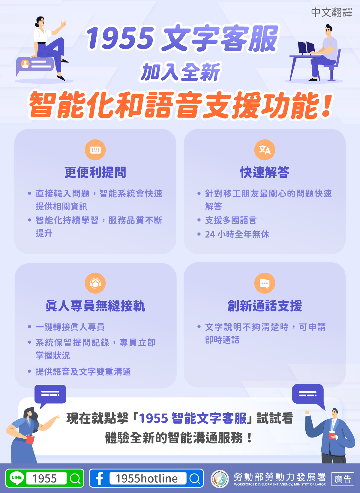 活動訊息:1955文字客服加入全新智能化和語音支援功能-多國語言版