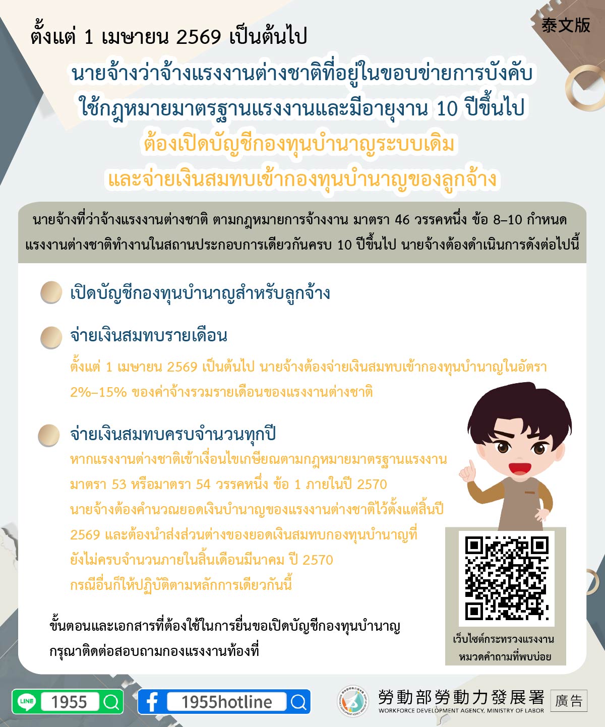 ▍ตั้งแต่ 1 เมษายน 2569 เป็นต้นไป นายจ้างว่าจ้างแรงงานต่างชาติที่อยู่ในขอบข่ายการบังคับใช้กฎหมายมาตรฐานแรงงานและมีอายุงาน 10 ปีขึ้นไปต้องเปิดบัญชีกองทุนบำนาญระบบเดิม และจ่ายเงินสมทบเข้ากองทุนบำนาญของลูกจ้าง