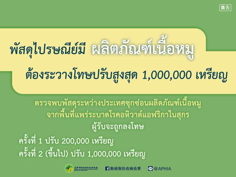 活動訊息:พัสดุไปรษณีย์มี ผลิตภัณฑ์เนื้อหมู ต้องระวางโทษปรับสูงสุด 1,000,000 เหรียญ