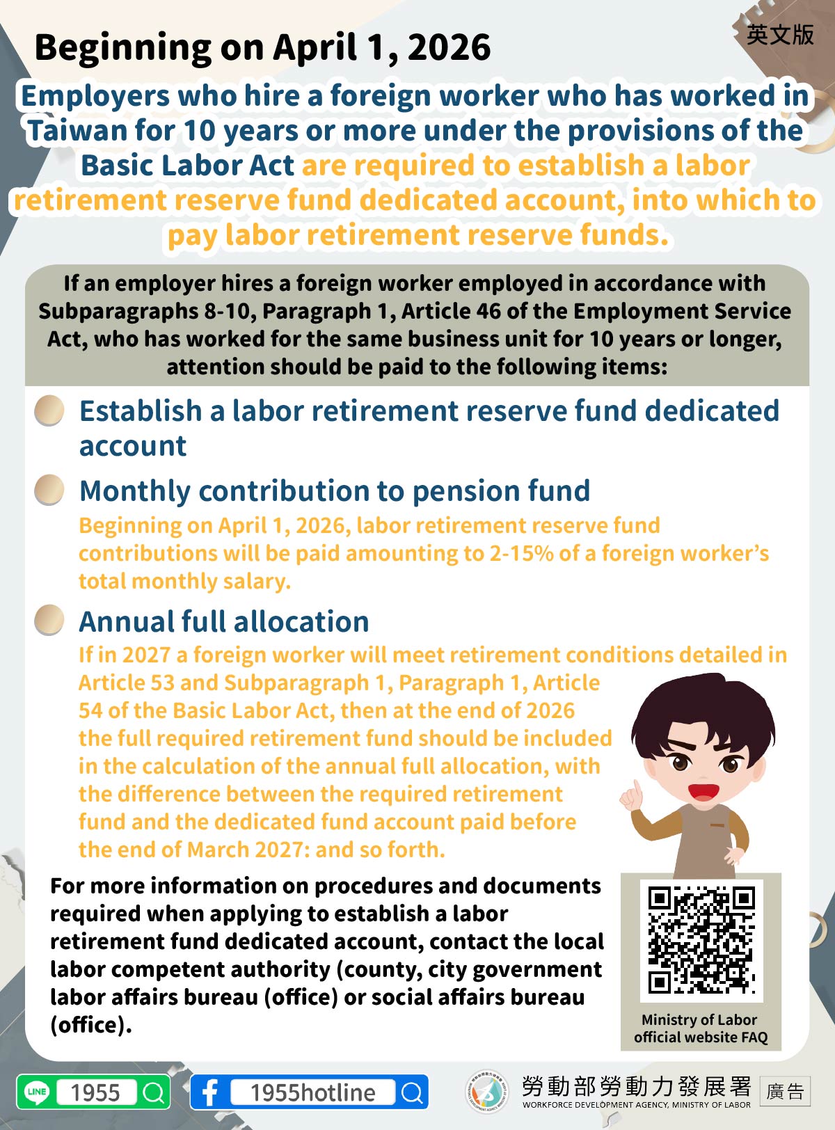 ▍Beginning on April 1, 2026 Employers who hire a foreign worker who has worked in Taiwan for 10 years or more under the provisions of the Basic Labor Act are required to establish a labor retirement reserve fund dedicated account, into which to pay labor retirement reserve funds.