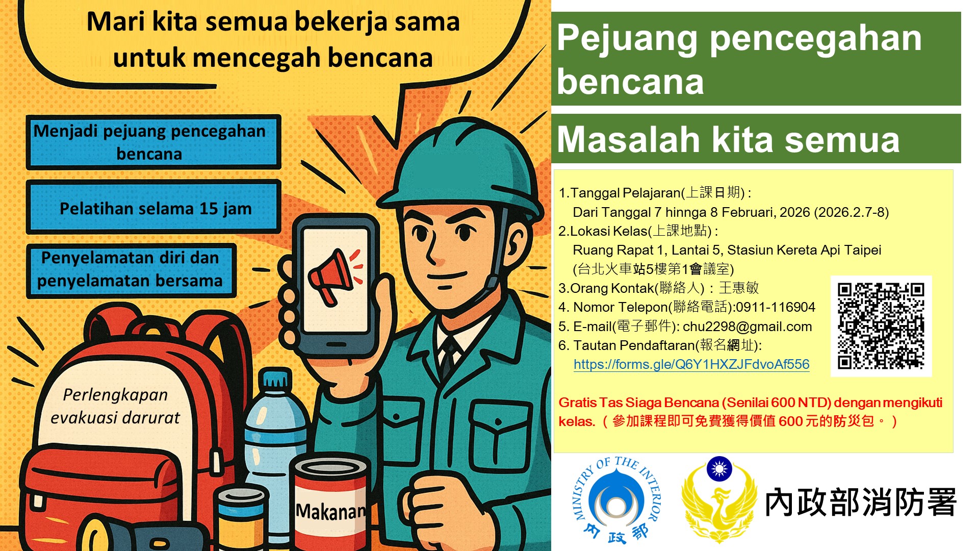 Gratis Tas Siaga Bencana (Senilai 600 NTD) dengan mengikuti kelas.