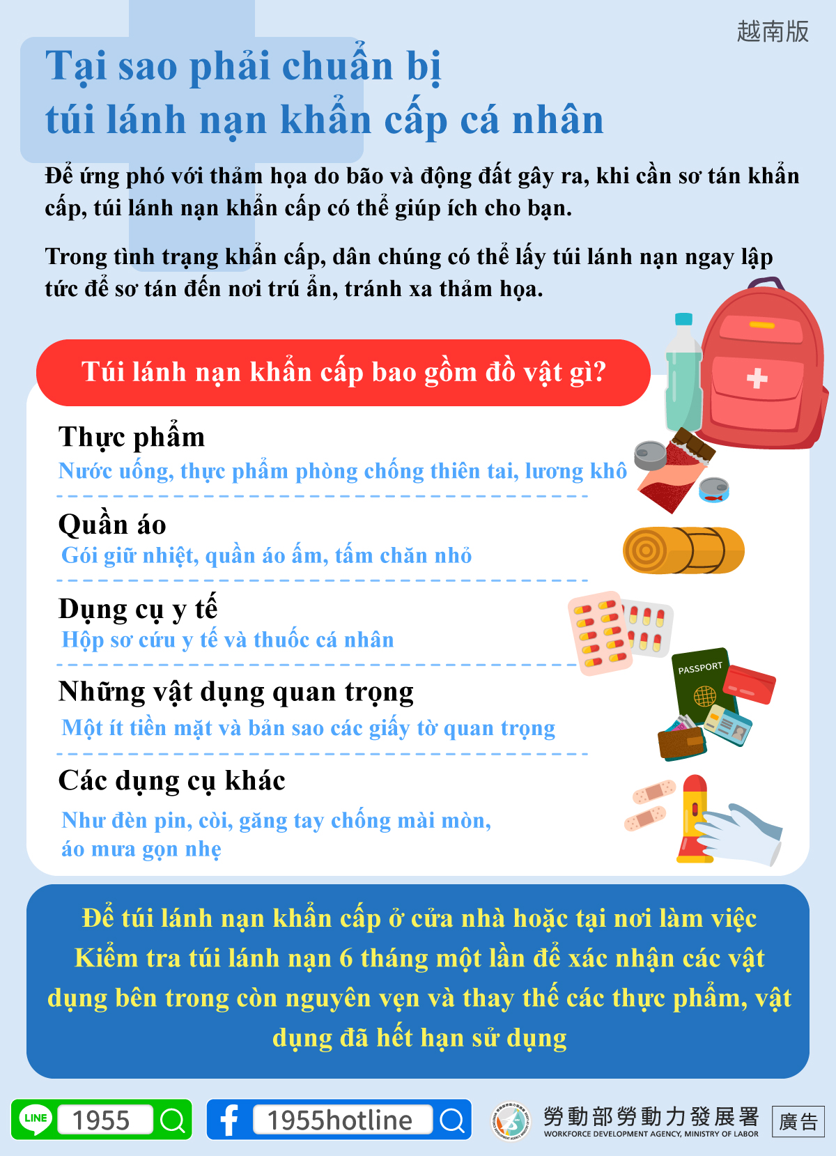 Kiểm tra túi lánh nạn 6 tháng một lần để xác nhận các vật dụng bên trong còn nguyên vẹn và thay thế các thực phẩm, vật dụng đã hết hạn sử dụng