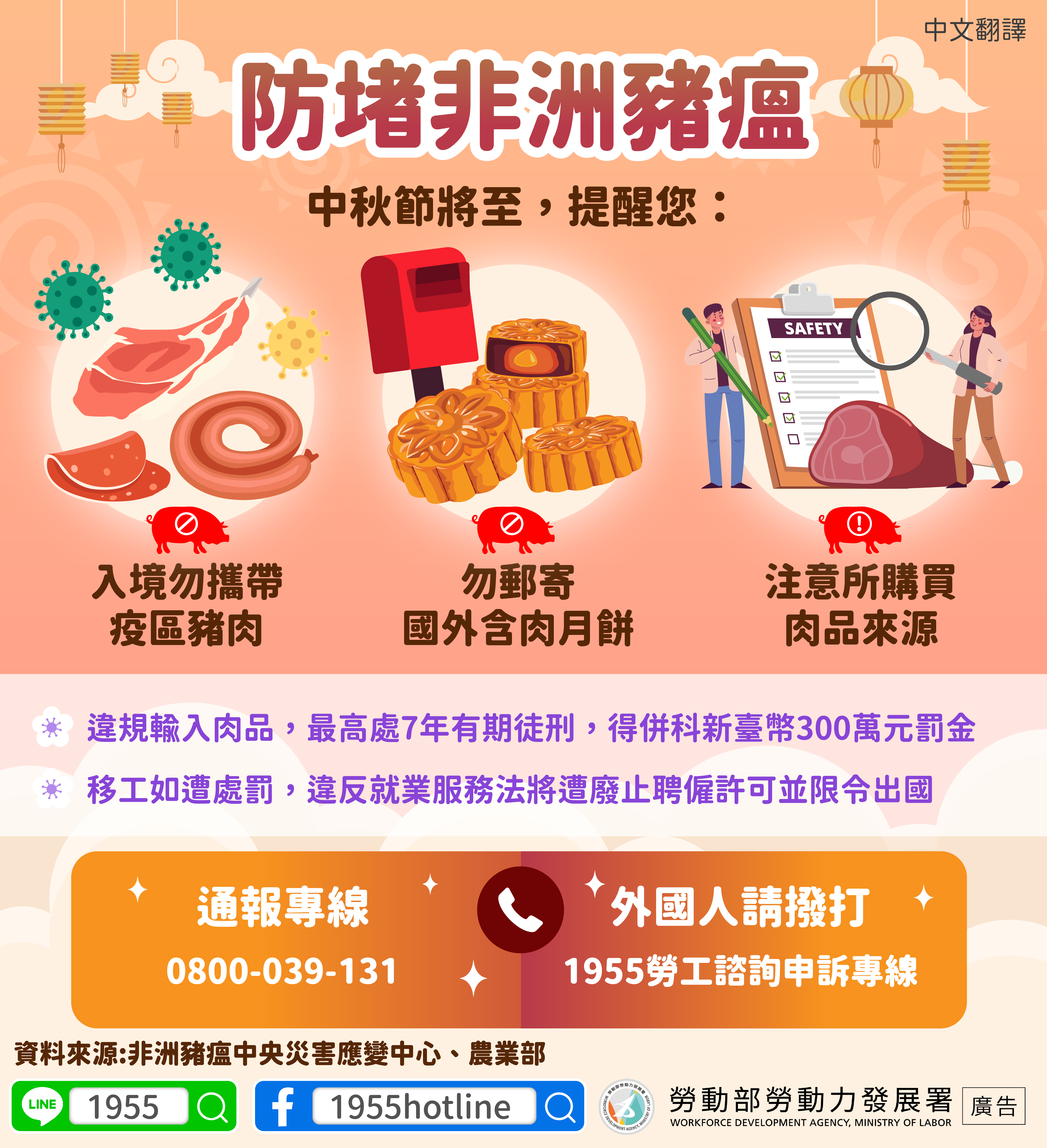1.Do not bring pork products into Taiwan from areas where African Swine Fever is spreading