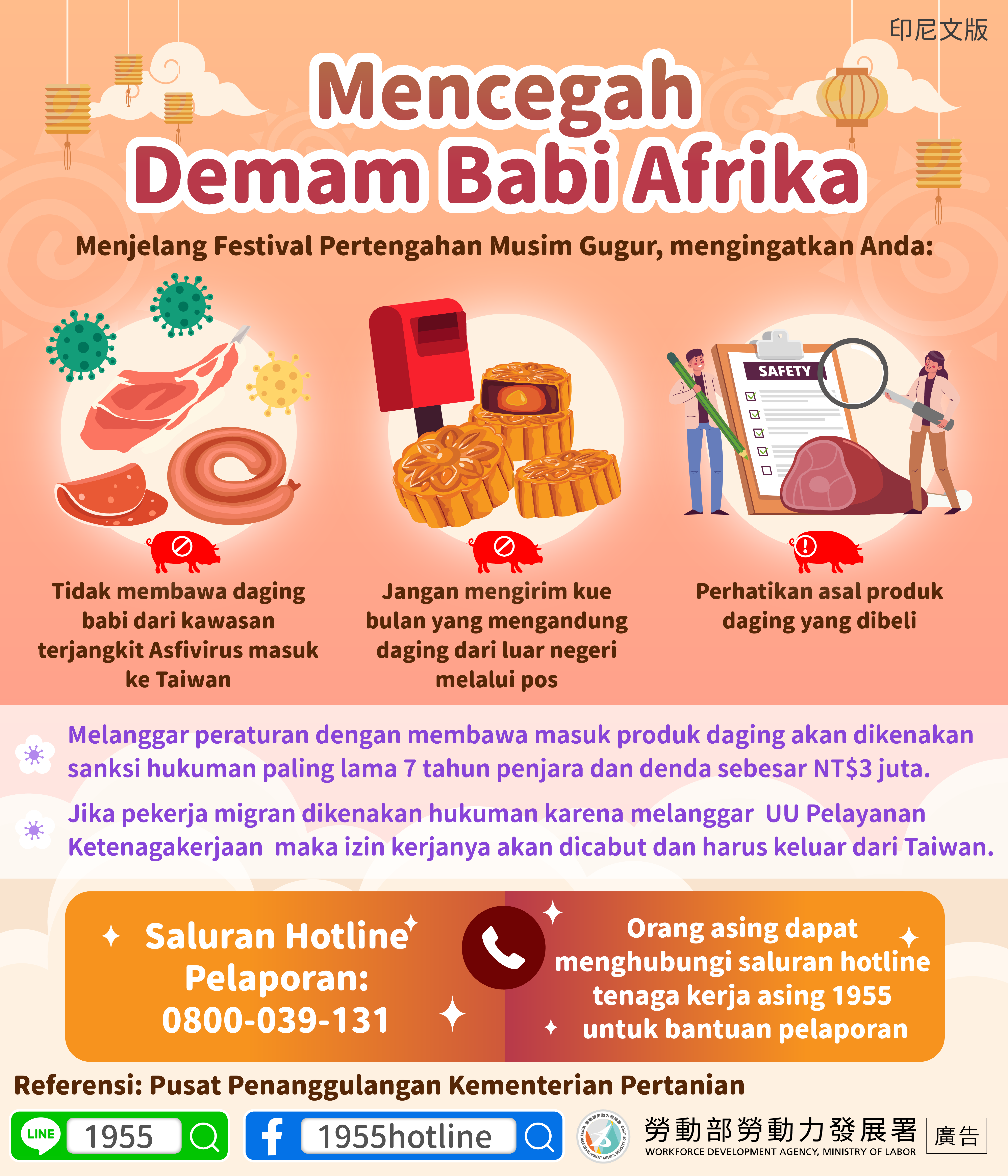 ※ Melanggar peraturan dengan membawa masuk produk daging akan dikenakan sanksi hukuman paling lama 7 tahun penjara dan denda sebesar NT$3 juta.