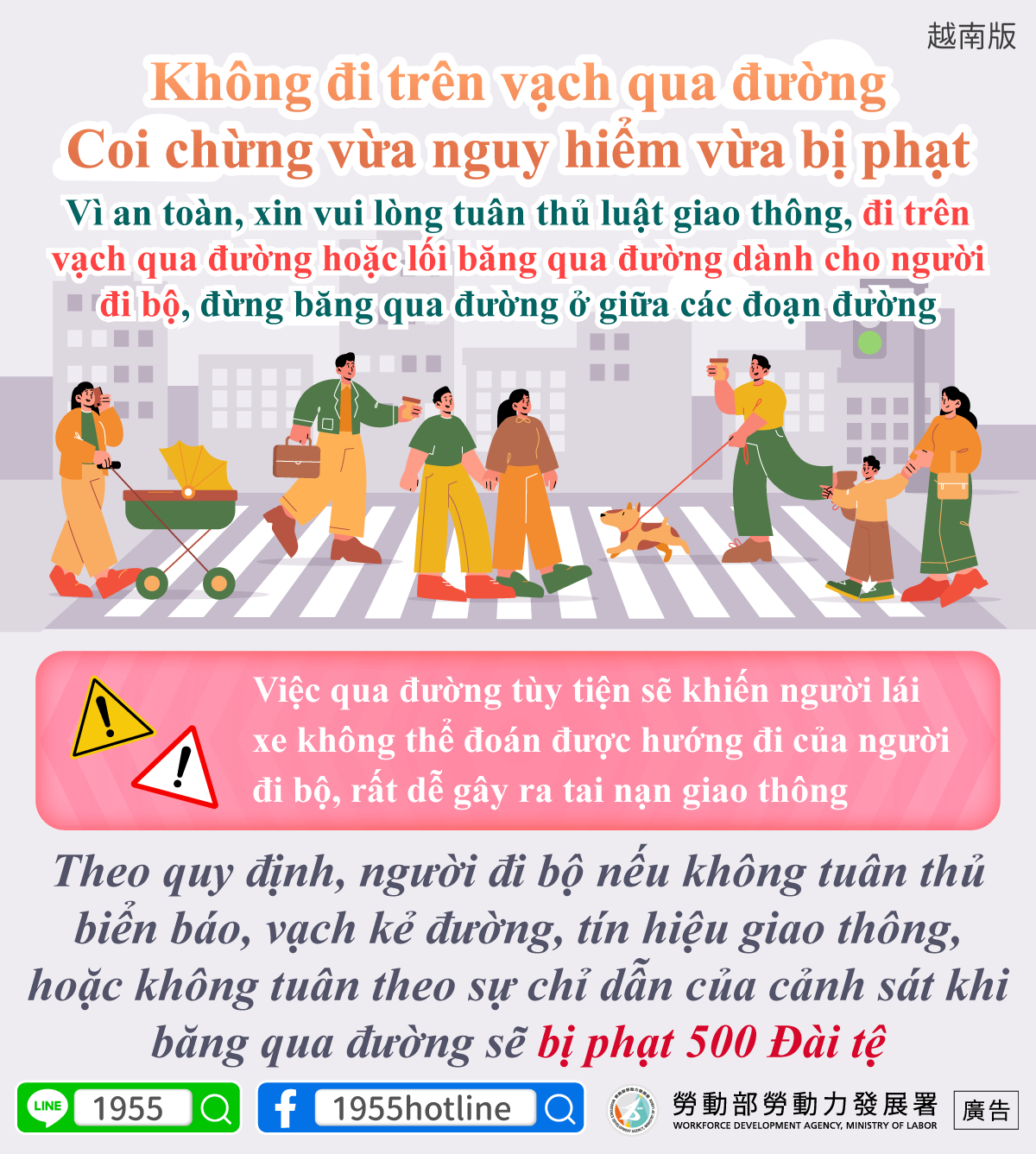 Theo quy định, người đi bộ nếu không tuân thủ biển báo, vạch kẻ đường, tín hiệu giao thông, hoặc không tuân theo sự chỉ dẫn của cảnh sát khi băng qua đường sẽ bị phạt 500 Đài tệ