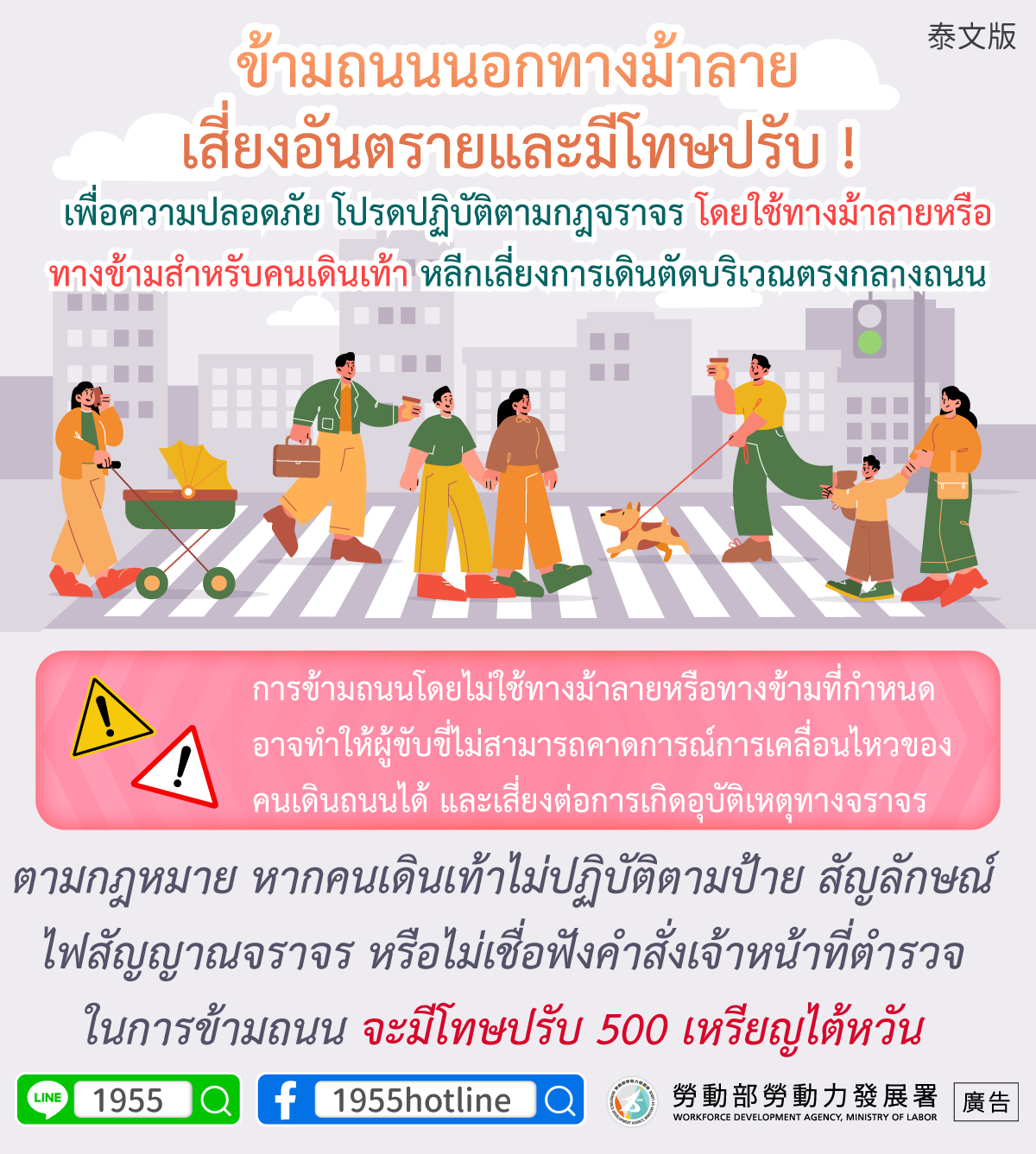 เพื่อความปลอดภัย โปรดปฏิบัติตามกฎจราจร โดยใช้ทางม้าลายหรือทางข้ามสำหรับคนเดินเท้า หลีกเลี่ยงการเดินตัดบริเวณตรงกลางถนน
