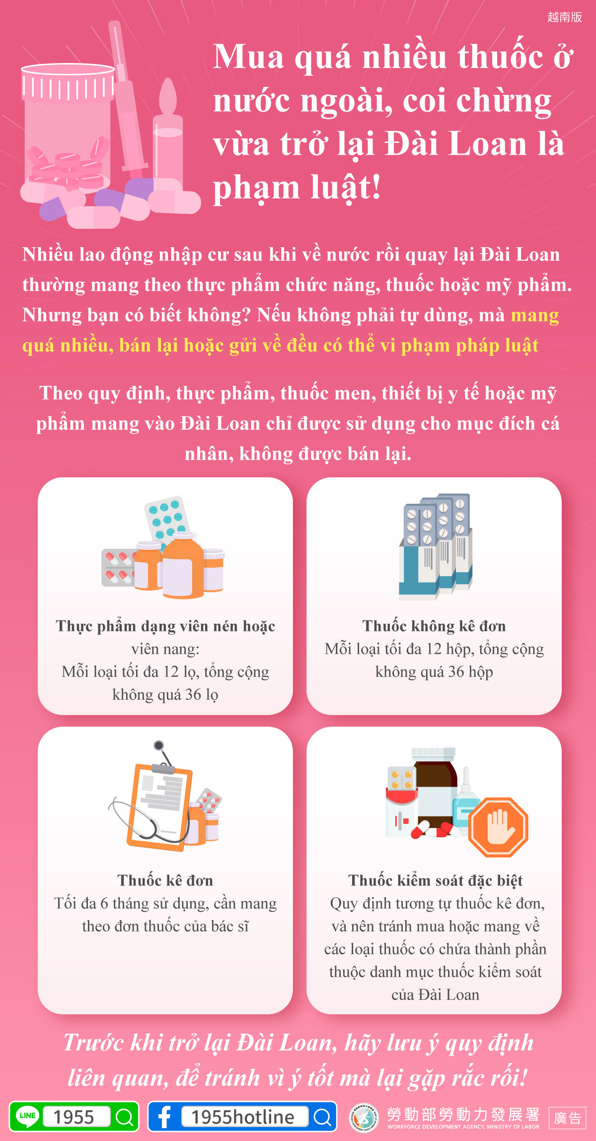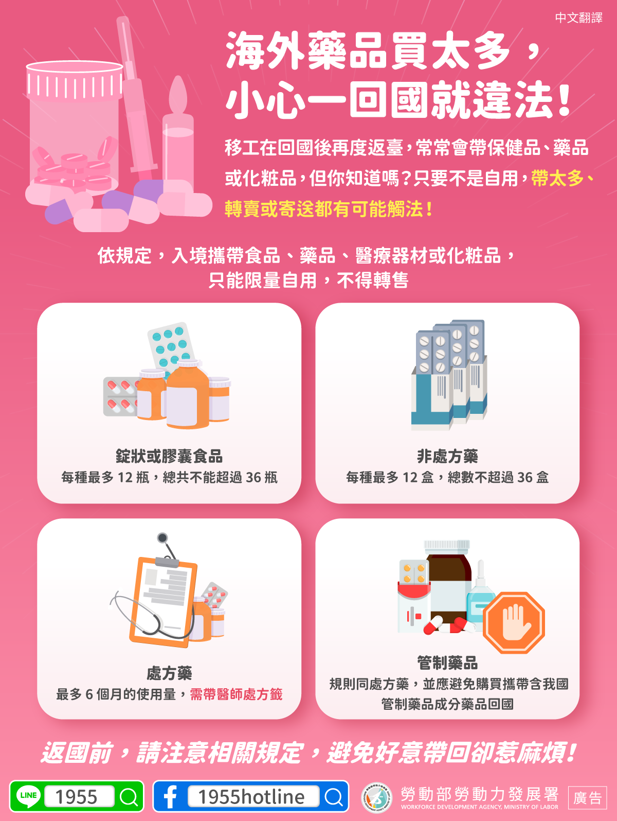 แรงงานต่างชาติเมื่อกลับประเทศแล้วเดินทางกลับไต้หวันอีกครั้ง มักนำผลิตภัณฑ์อาหารเสริม ยา หรือเครื่องสำอางติดตัวกลับมา แต่คุณรู้ไหม? หากไม่ใช่เพื่อการใช้ส่วนตัว พกยาจำนวนมากเกินไป นำไปขายต่อ หรือส่งต่อ อาจเข้าข่ายผิดกฎหมาย!