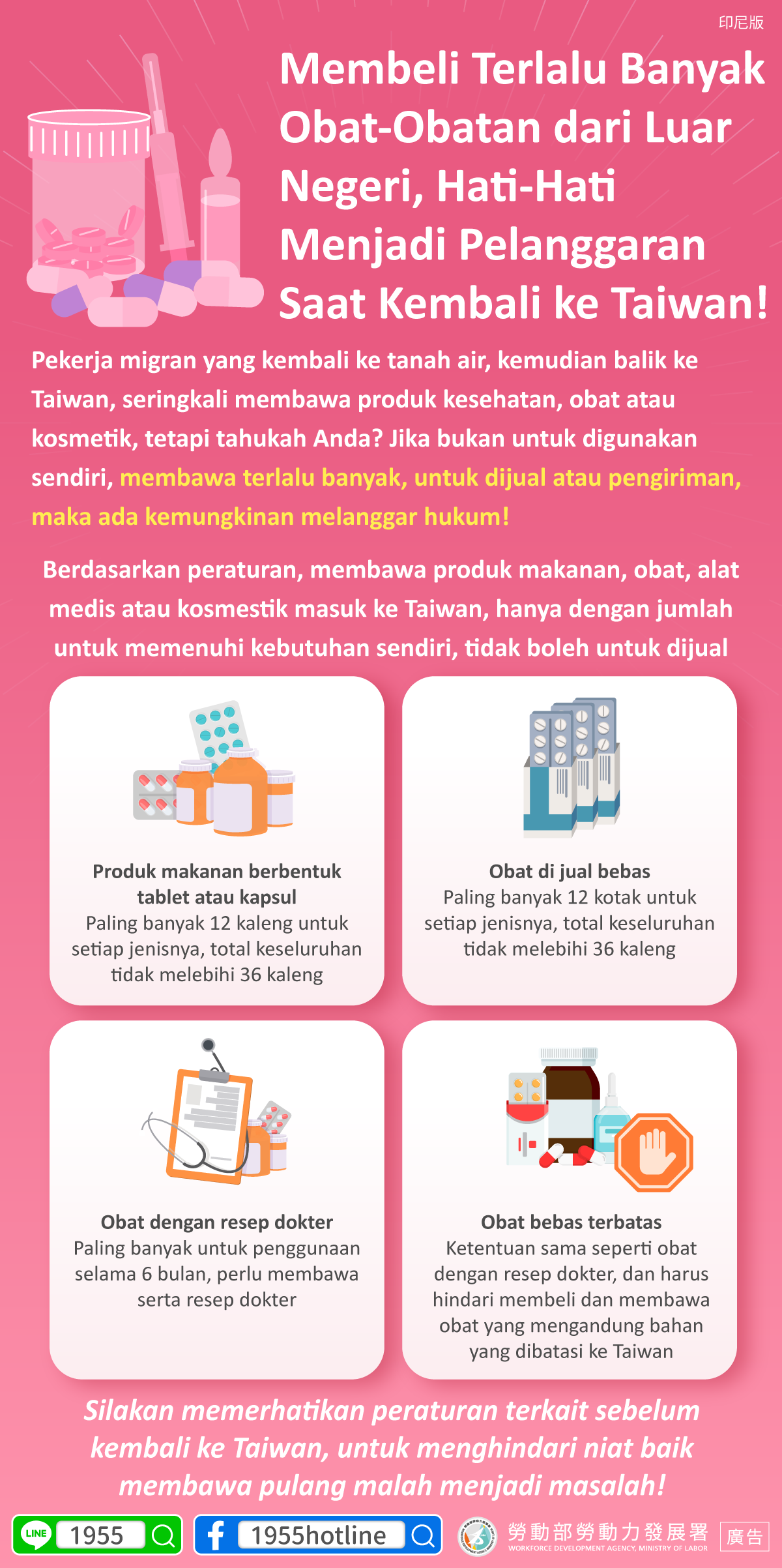 Pekerja migran yang kembali ke tanah air, kemudian balik ke Taiwan, seringkali membawa produk kesehatan, obat atau kosmetik, tetapi tahukah Anda? Jika bukan untuk digunakan sendiri, membawa terlalu banyak, untuk dijual atau pengiriman, maka ada kemungkinan melanggar hukum!