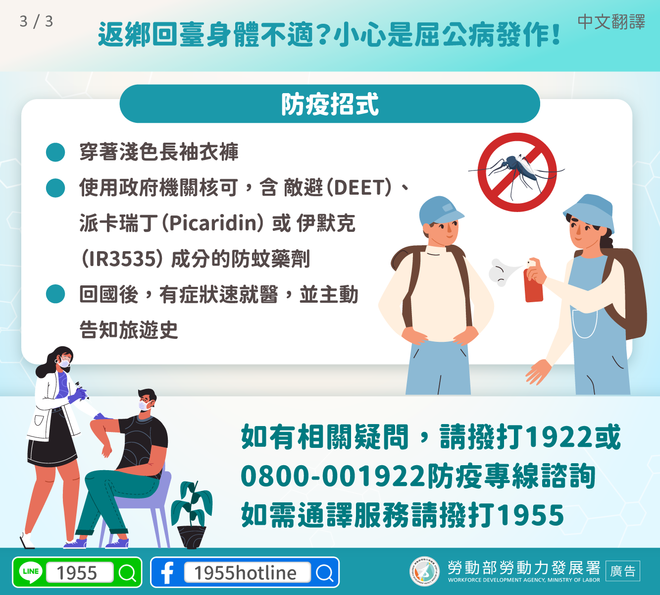 •Sau khi trở về Đài Loan, nếu có triệu chứng liên quan, hãy nhanh chóng đi khám, đồng thời chủ động thông báo lịch sử đi lại