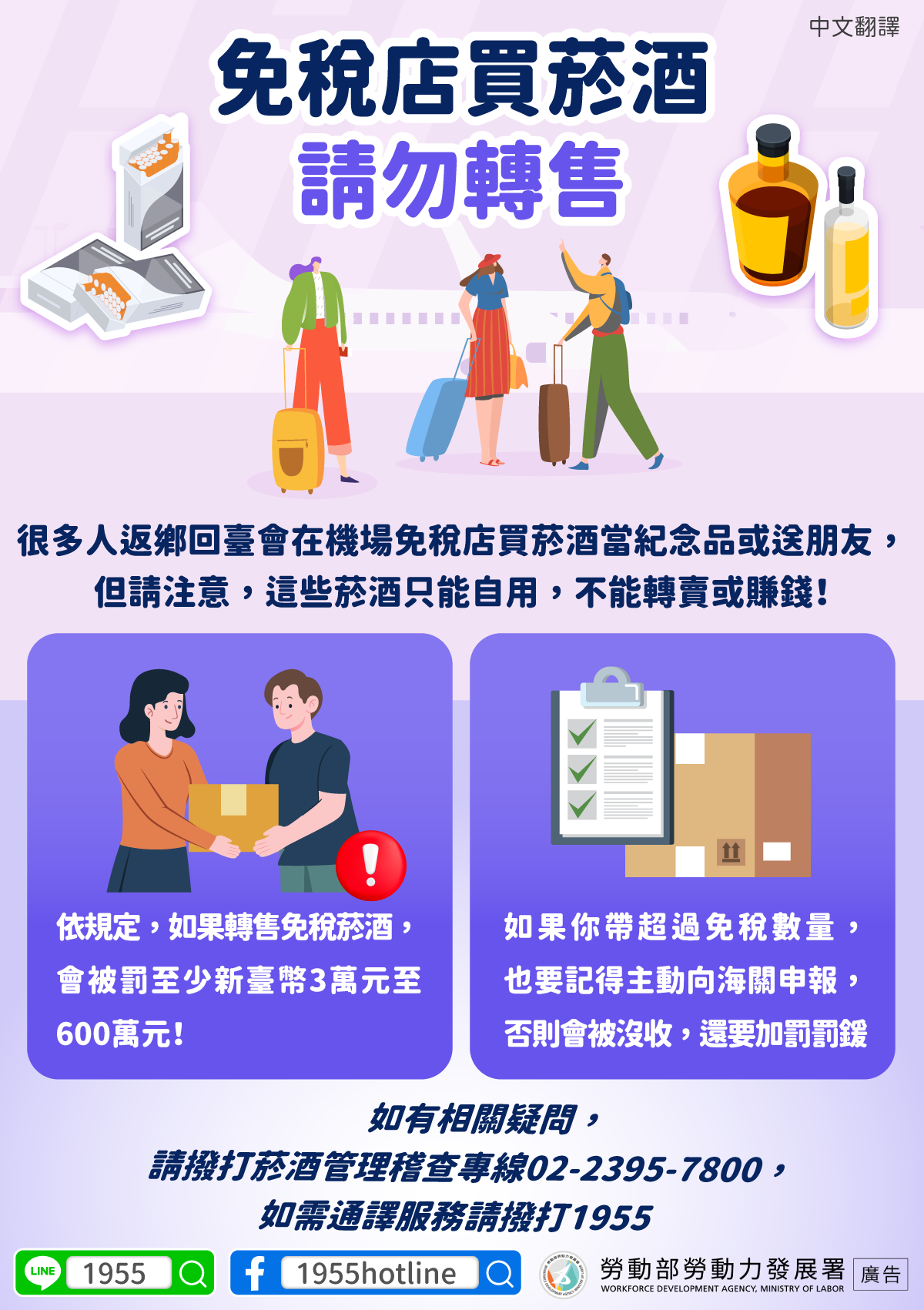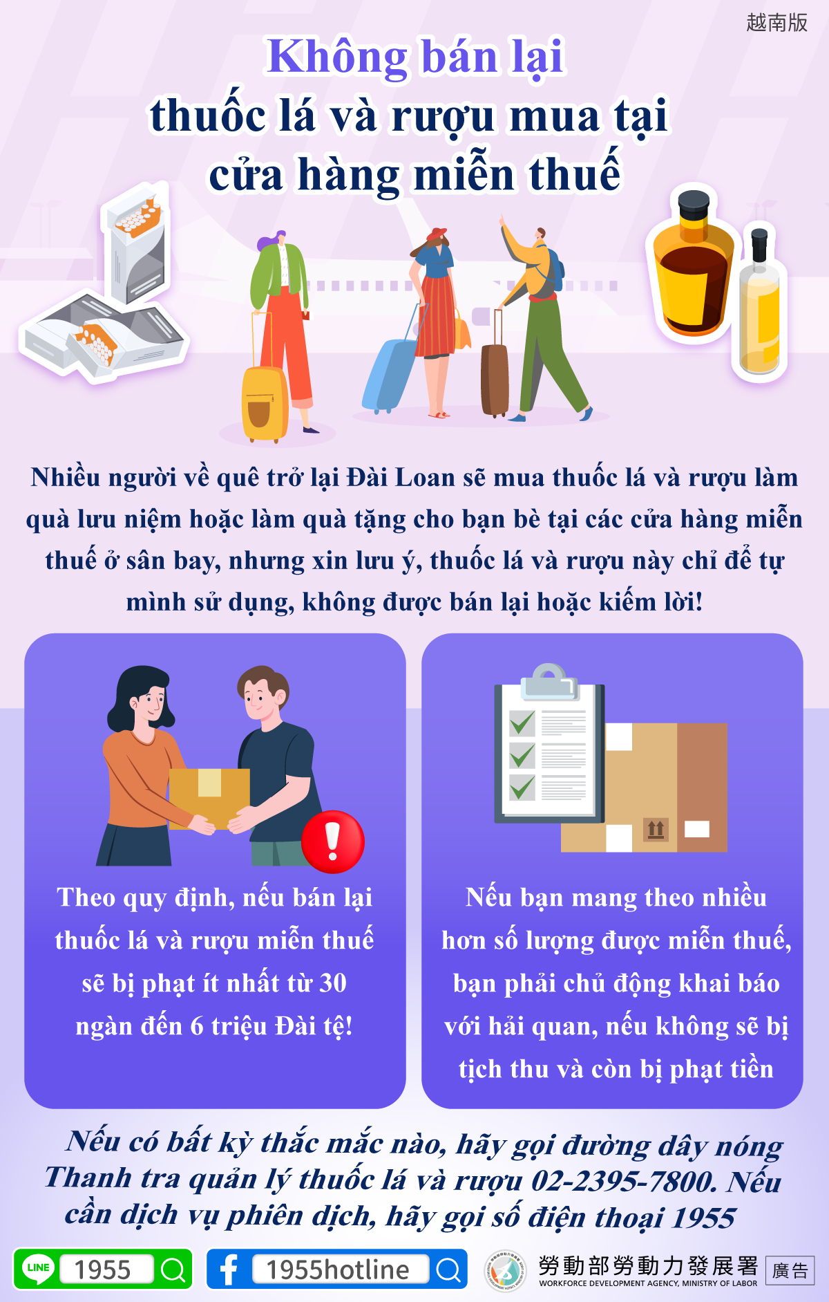 •Theo quy định, nếu bán lại thuốc lá và rượu miễn thuế sẽ bị phạt ít nhất từ 30 ngàn đến 6 triệu Đài tệ!