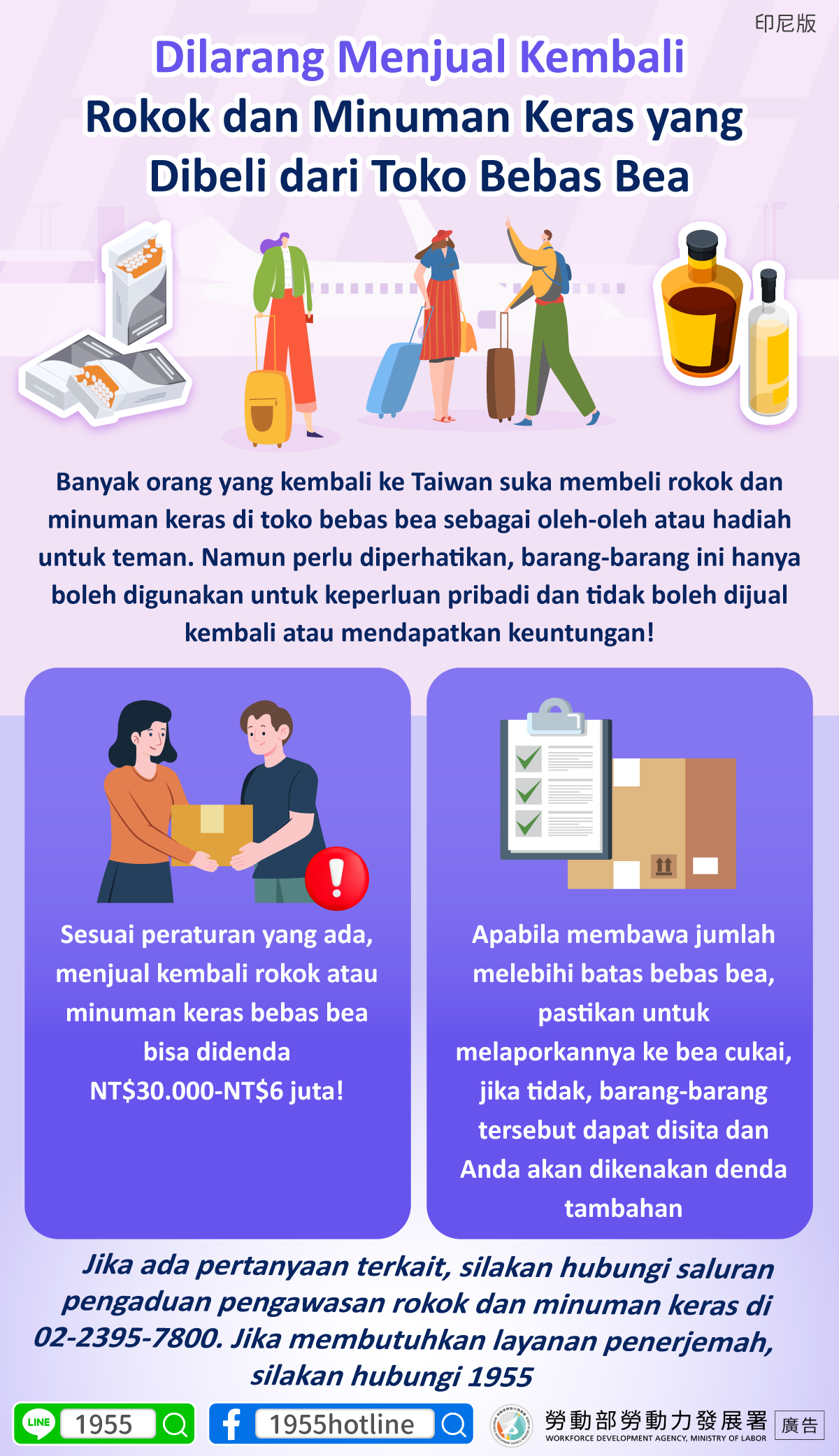 •Sesuai peraturan yang ada, menjual kembali rokok atau minuman keras bebas bea bisa didenda NT$30.000-NT$6 juta!