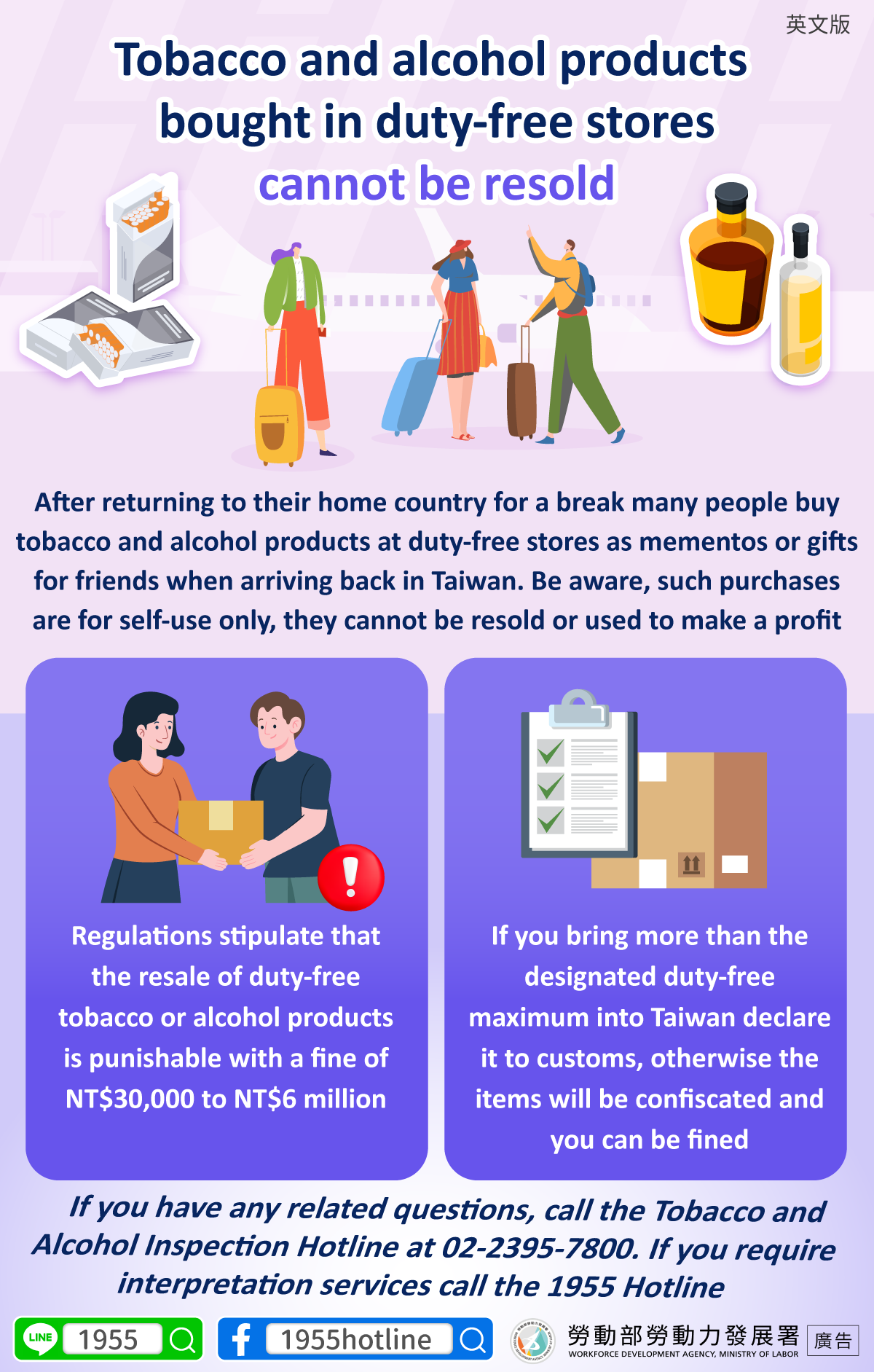 •Regulations stipulate that the resale of duty-free tobacco or alcohol products is punishable with a fine of NT$30,000 to NT$6 million