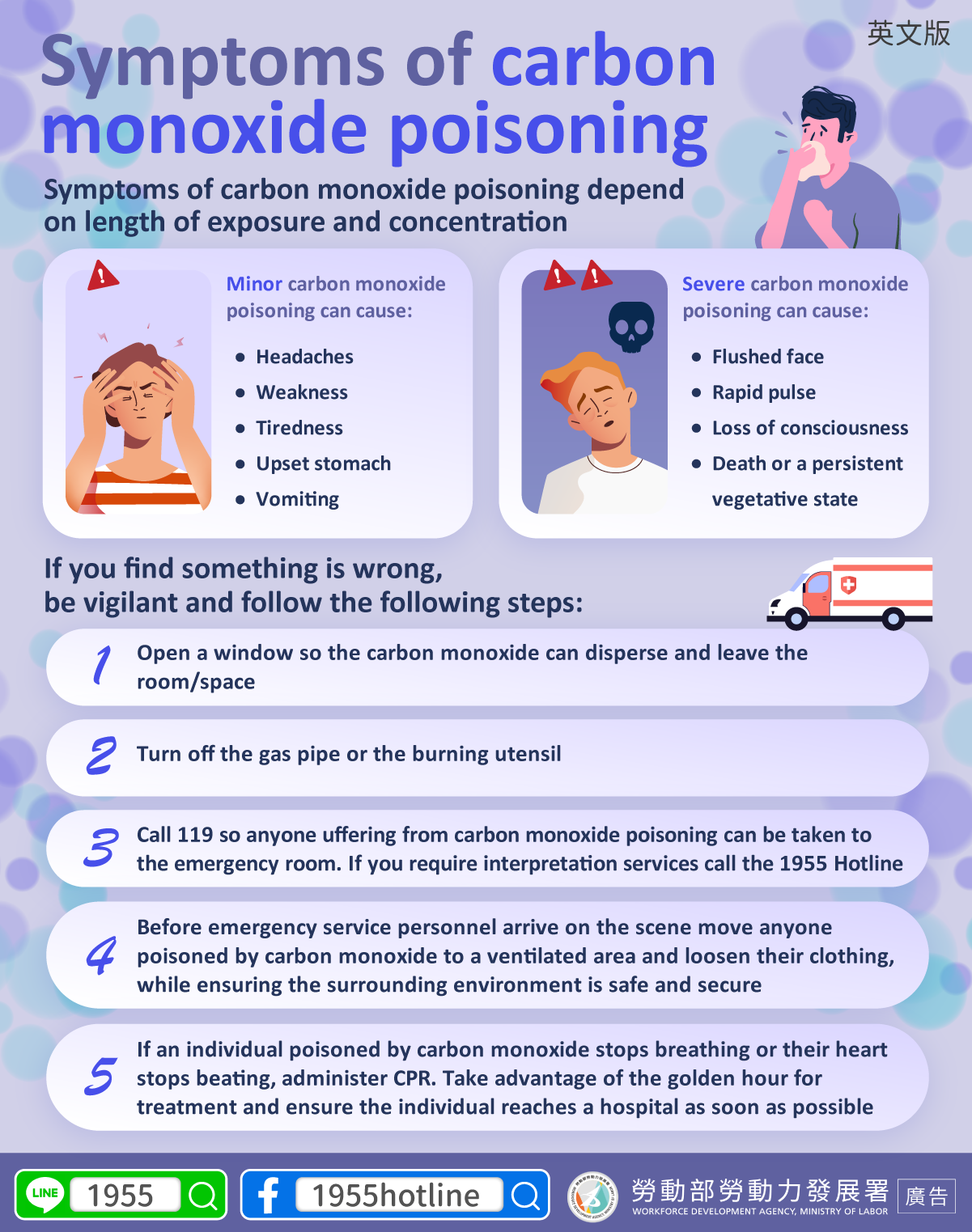 3.Call 119 so anyone uffering from carbon monoxide poisoning can be taken to the emergency room. If you require interpretation services call the 1955 Hotline