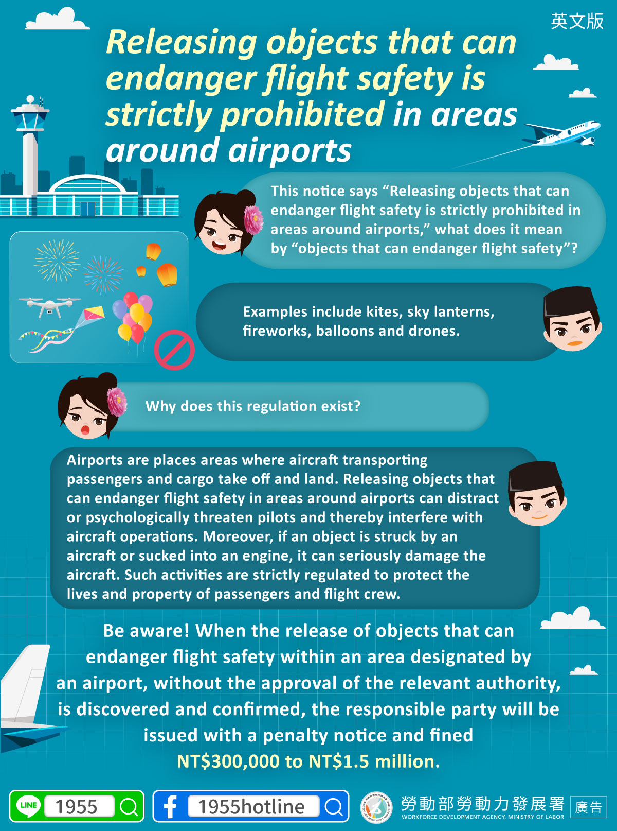 Be aware! When the release of objects that canendanger flight safety within an area designated byan airport, without the approval of the relevant authority,is discovered and confirmed, the responsible party will beissued with a penalty notice and finedNT$300,000 to NT$1.5 million.
