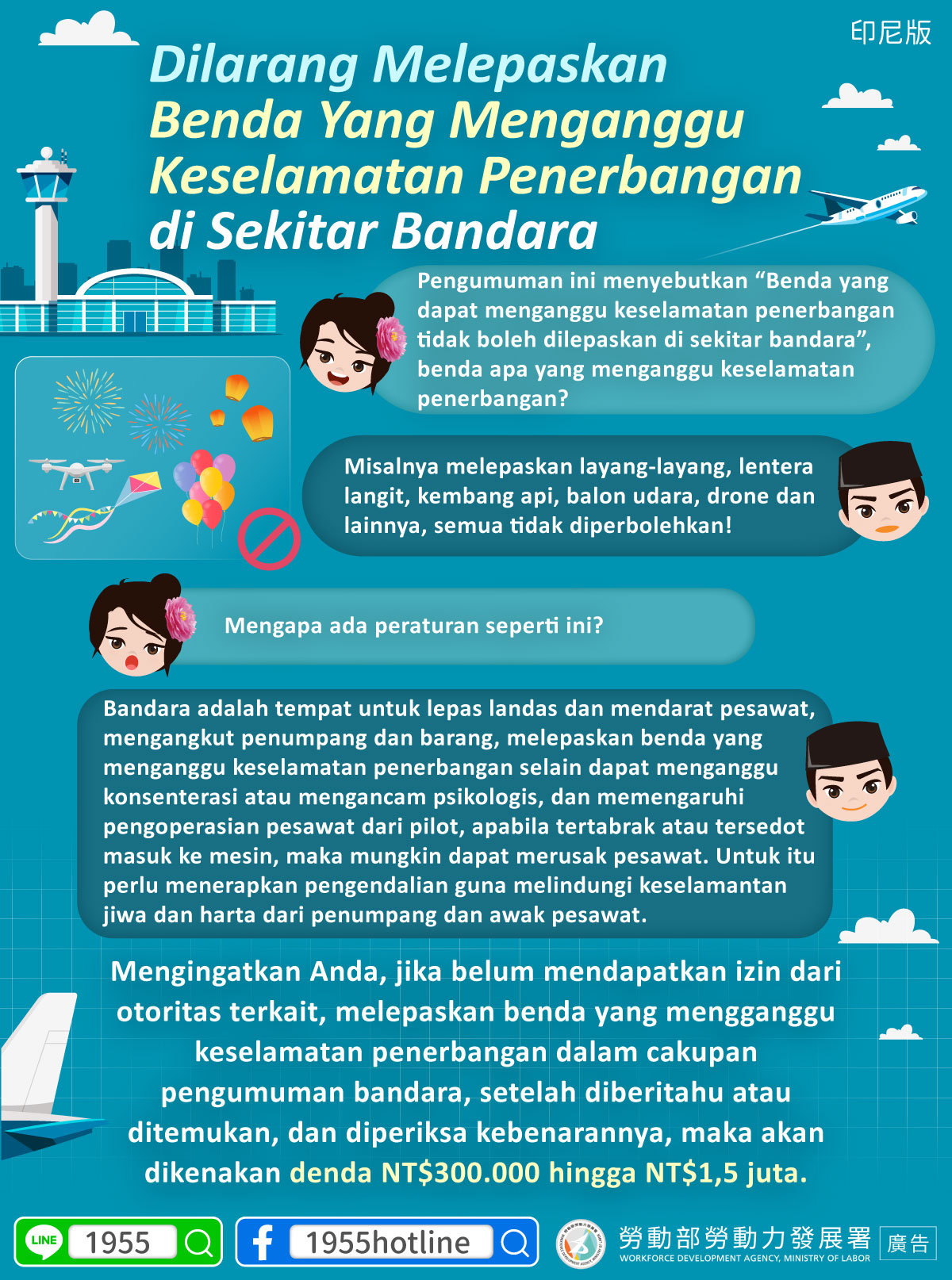 Mengingatkan Anda, jika belum mendapatkan izin dari otoritas terkait, melepaskan benda yang mengganggu keselamatan penerbangan dalam cakupan pengumuman bandara, setelah diberitahu atau ditemukan, dan diperiksa kebenarannya, maka akan dikenakan denda NT$300.000 hingga NT$1,5 juta.