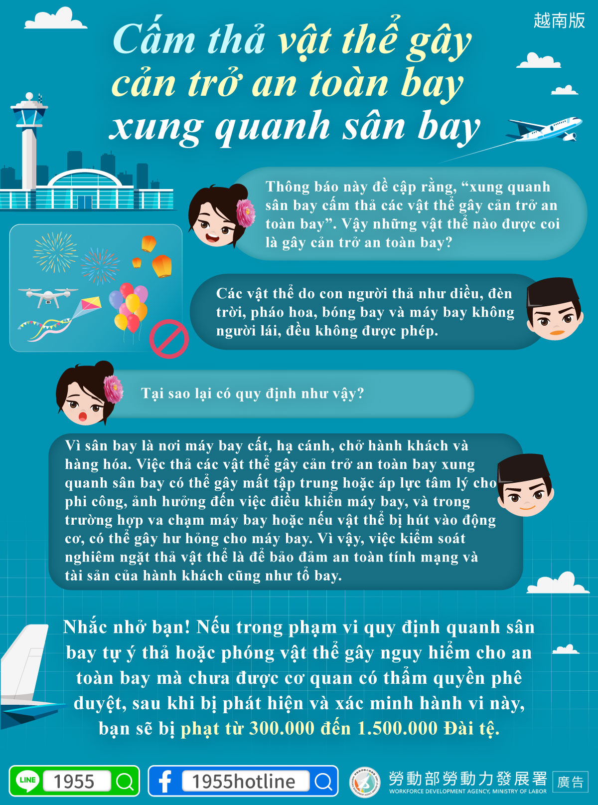 Nhắc nhở bạn! Nếu trong phạm vi quy định quanh sân bay tự ý thả hoặc phóng vật thể gây nguy hiểm cho an toàn bay mà chưa được cơ quan có thẩm quyền phê duyệt, sau khi bị phát hiện và xác minh hành vi này, bạn sẽ bị phạt từ 300.000 đến 1.500.000 Đài tệ.
