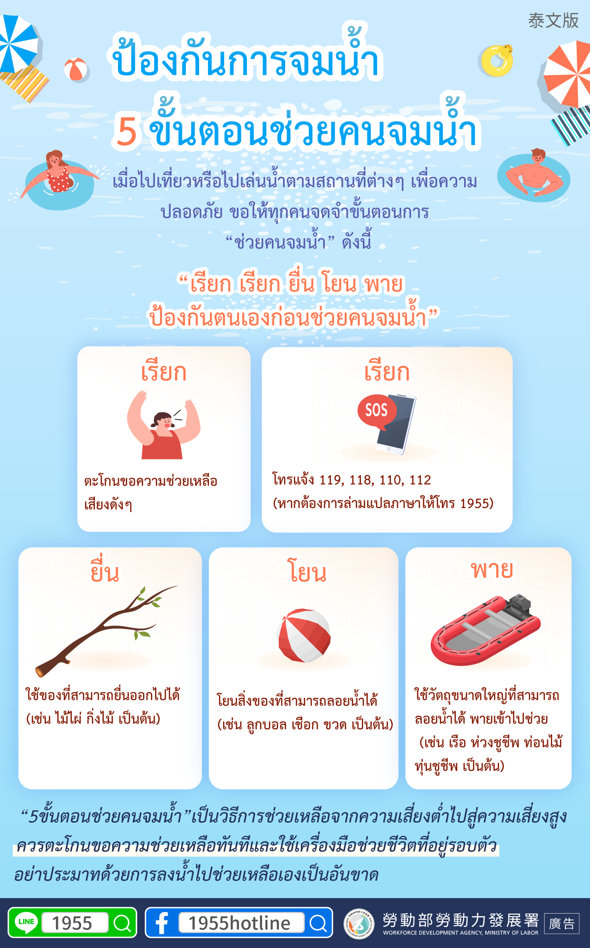 “เรียก เรียก ยื่น โยน พาย ป้องกันตนเองก่อนช่วยคนจมน้ำ”