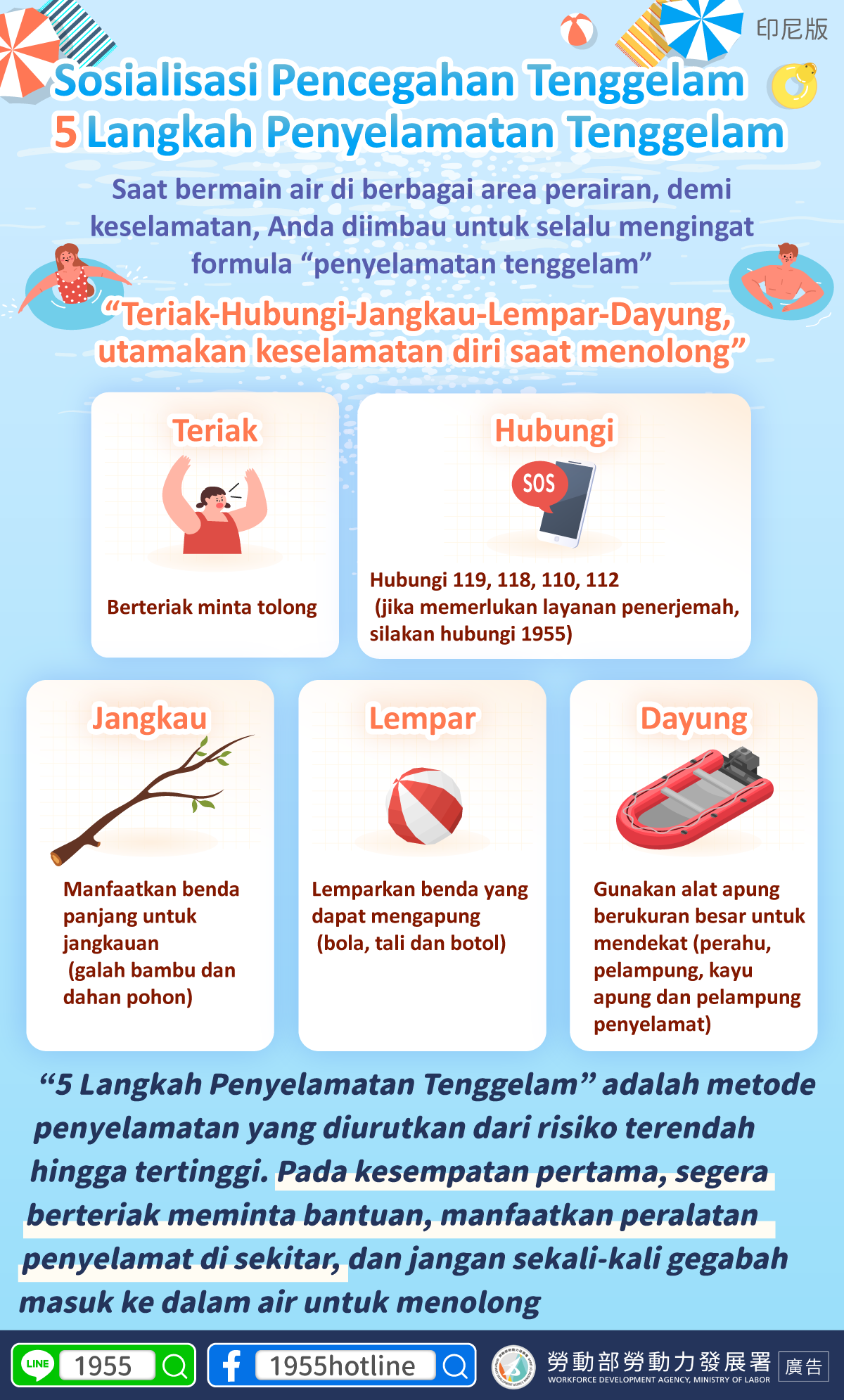 “5 Langkah Penyelamatan Tenggelam” adalah metode penyelamatan yang diurutkan dari risiko terendah hingga tertinggi. Pada kesempatan pertama, segera berteriak meminta bantuan, manfaatkan peralatan penyelamat di sekitar, dan jangan sekali-kali gegabah masuk ke dalam air untuk menolong