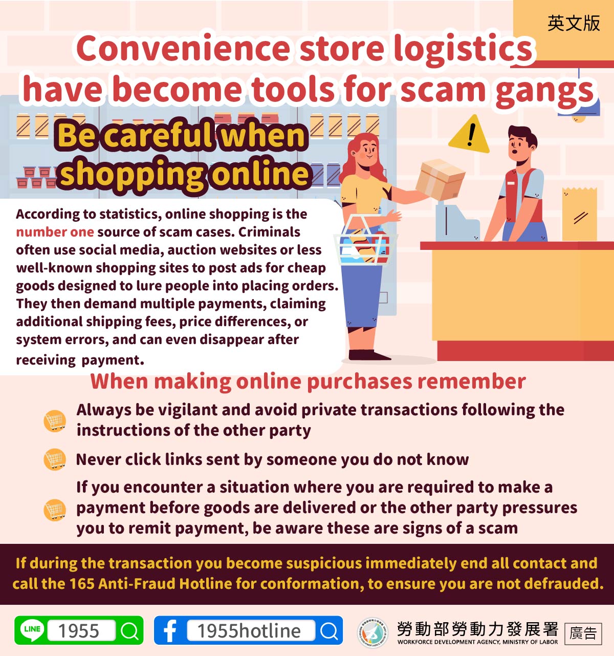 If during the transaction you become suspicious immediately end all contact and call the 165 Anti-Fraud Hotline for conformation, to ensure you are not defrauded.