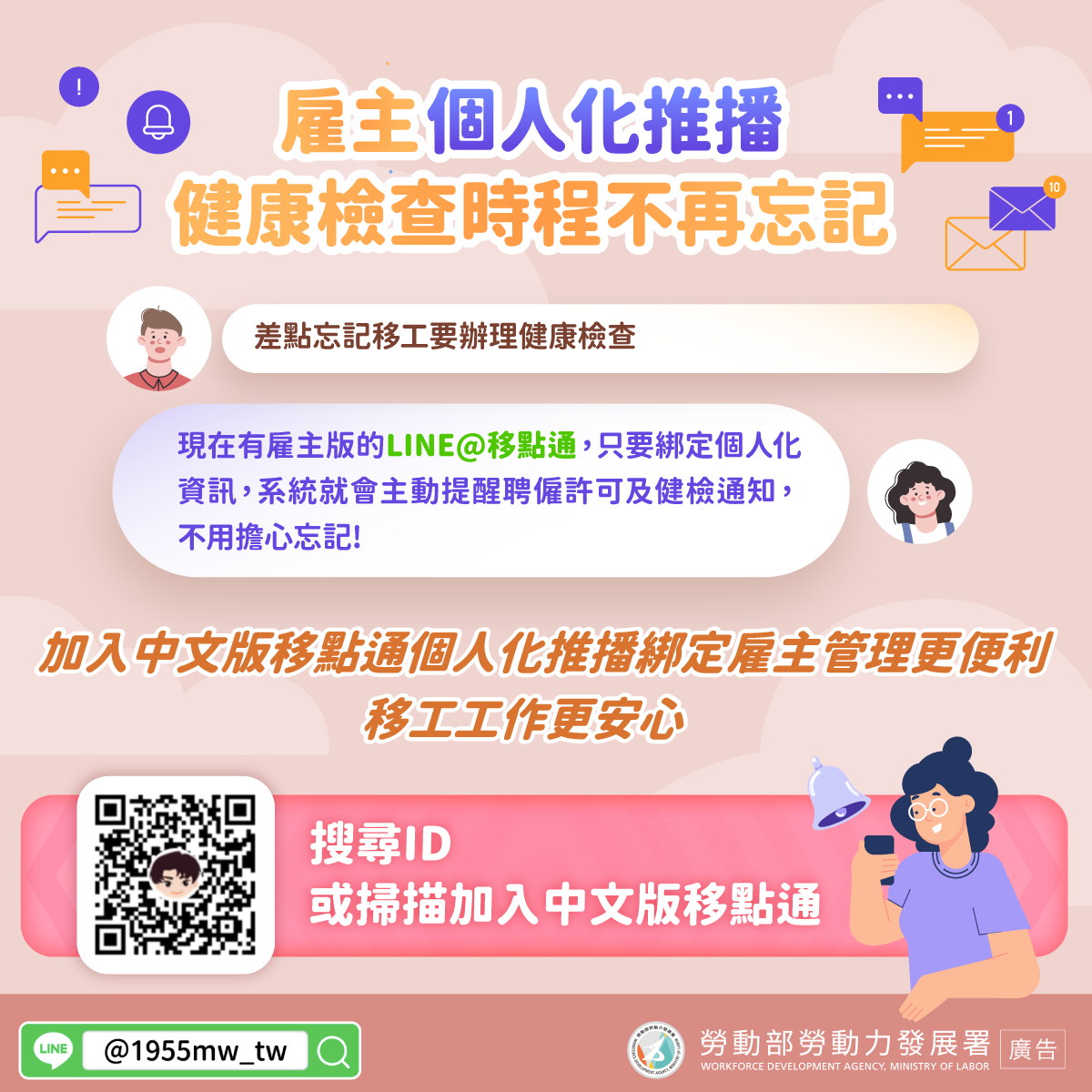 B:現在有雇主版的LINE@移點通,只要綁定個人化資訊,系統就會主動提醒聘僱許可及健檢通知,不用擔心忘記!