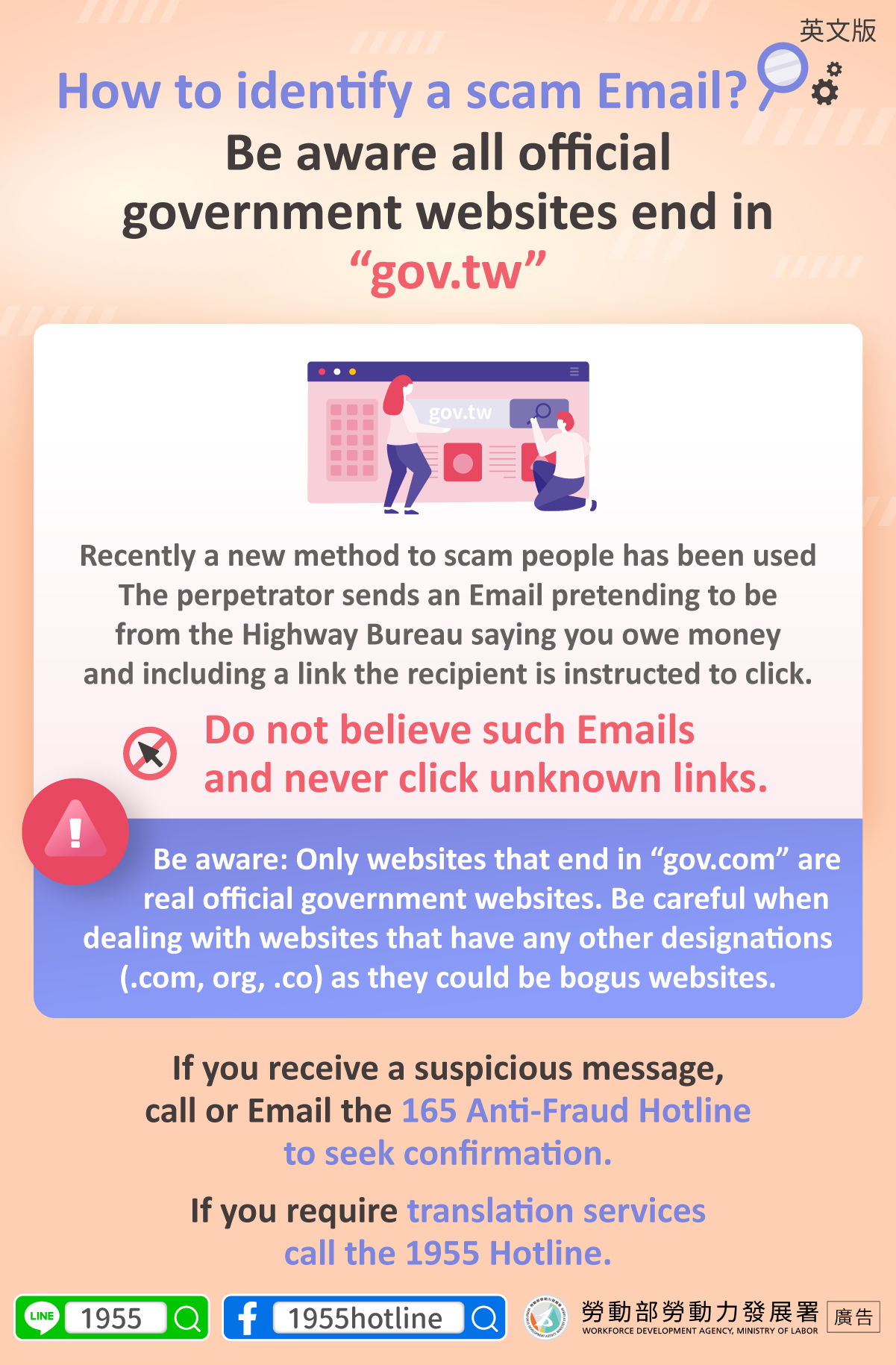 ▍จะสังเกตอีเมลหลอกลวงอย่างไร?โปรดสังเกตุเว็บไซต์ทางการไต้หวันจะลงท้ายด้วย“gov.tw ”