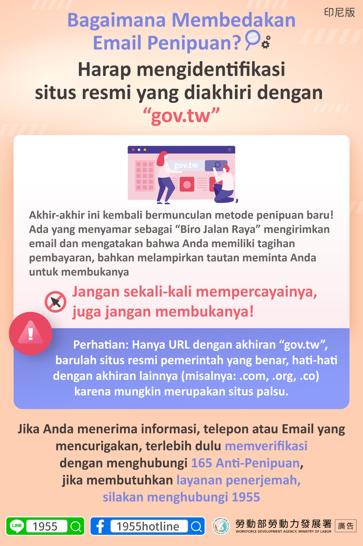 Jika Anda menerima informasi, telepon atau Email yang mencurigakan, terlebih dulu memverifikasidengan menghubungi 165 Anti-Penipuan,jika membutuhkan layanan penerjemah,silakan menghubungi 1955