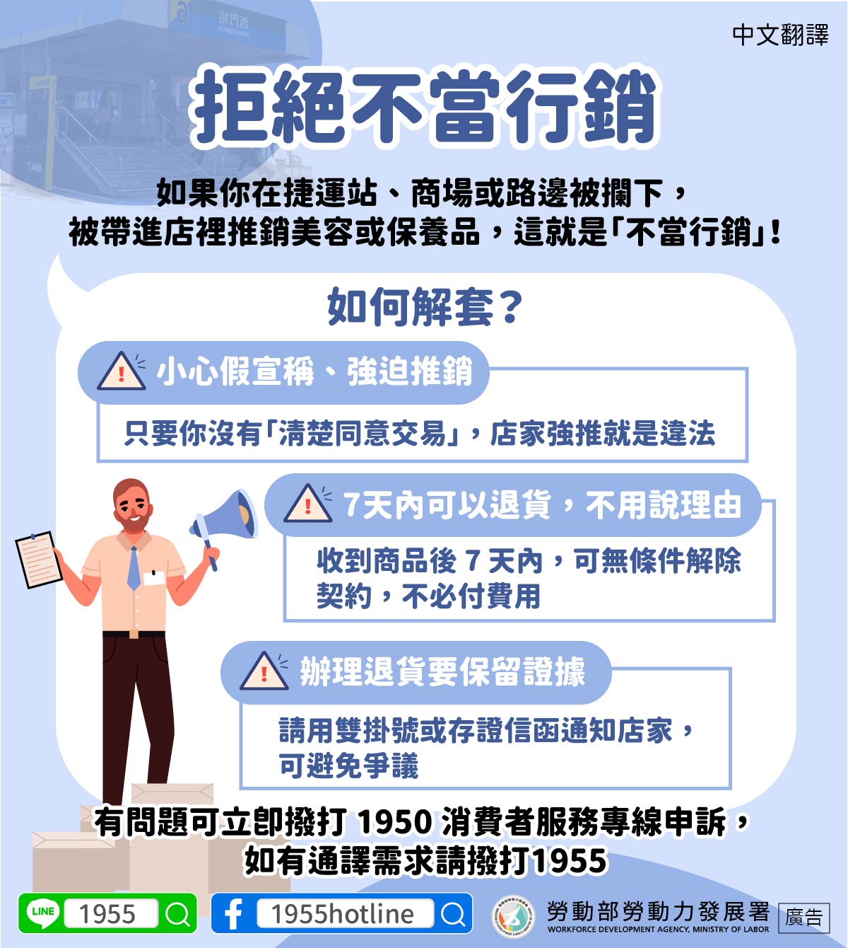 有問題可立即撥打 1950 消費者服務專線申訴,如有通譯需求請撥打1955