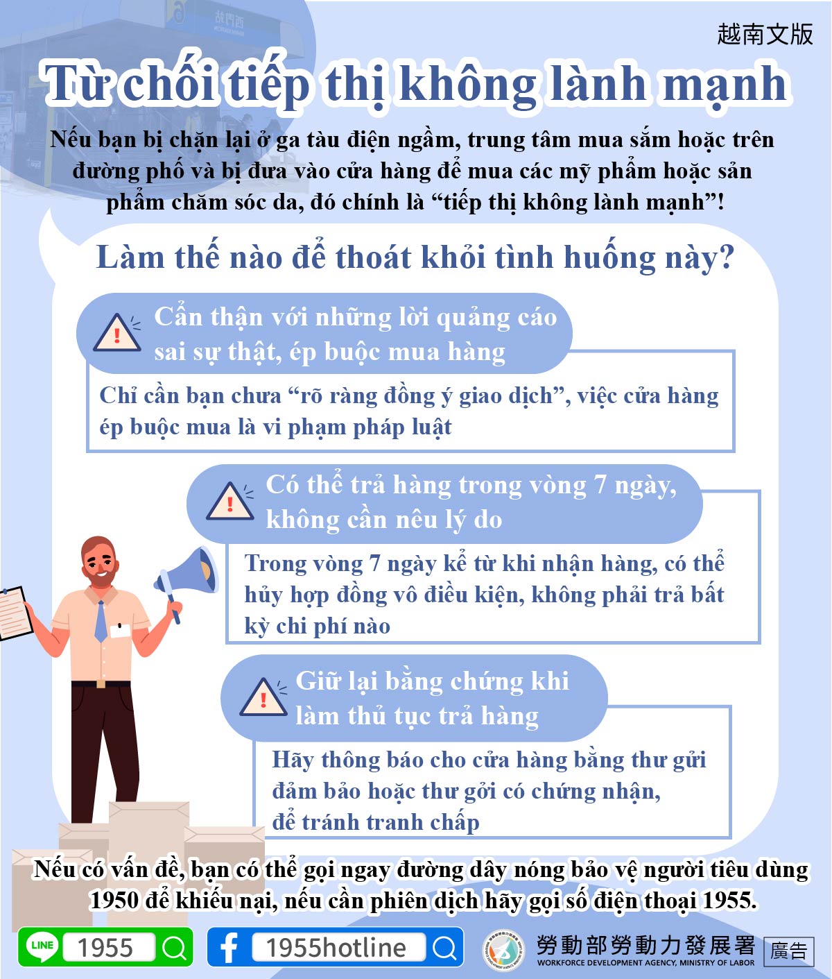 Nếu có vấn đề, bạn có thể gọi ngay đường dây nóng bảo vệ người tiêu dùng 1950 để khiếu nại, nếu cần phiên dịch hãy gọi số điện thoại 1955.