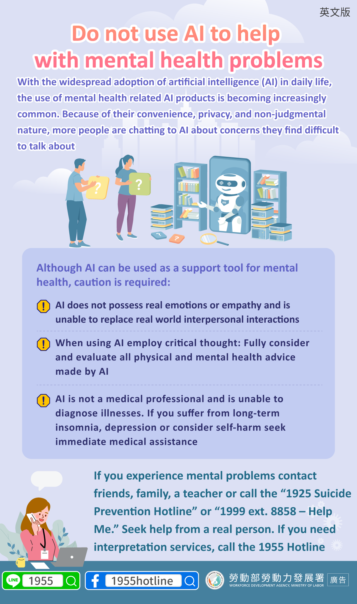 Apabila mengalami gangguan psikologis, harap dikomunikasikan dengan keluarga, teman, guru atau menghubungi “1925 – Hotline Dukungan Psikologis”, “1999 ext 8858” untuk layanan konsultasi. Biarkan “Manusia Nyata” membantu Anda, apabila memerlukan layanan penerjemahan silakan hubungi 1955