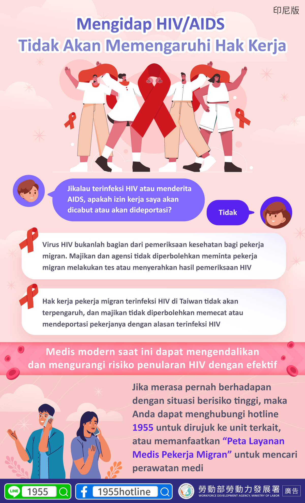 Hak kerja pekerja migran terinfeksi HIV di Taiwan tidak akan terpengaruh, dan majikan tidak diperbolehkan memecat atau mendeportasi pekerjanya dengan alasan terinfeksi HIV