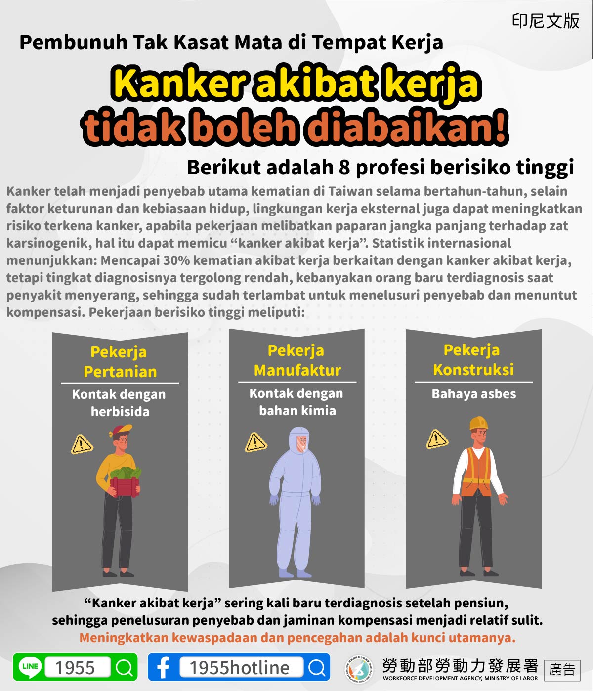 Kanker telah menjadi penyebab utama kematian di Taiwan selama bertahun-tahun, selain faktor keturunan dan kebiasaan hidup, lingkungan kerja eksternal juga dapat meningkatkan risiko terkena kanker, apabila pekerjaan melibatkan paparan jangka panjang terhadap zat karsinogenik, hal itu dapat memicu “kanker akibat kerja”. Statistik internasional menunjukkan: Mencapai 30% kematian akibat kerja berkaitan dengan kanker akibat kerja, tetapi tingkat diagnosisnya tergolong rendah, kebanyakan orang baru terdiagnosis saat penyakit menyerang, sehingga sudah terlambat untuk menelusuri penyebab dan menuntut kompensasi. Pekerjaan berisiko tinggi meliputi: